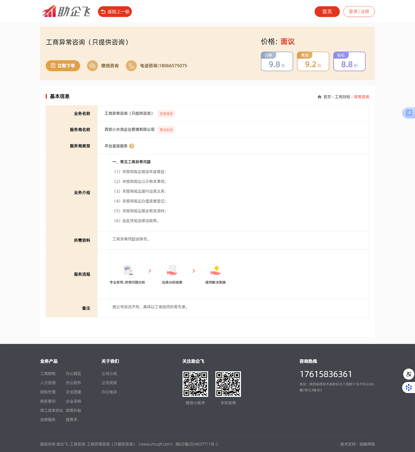 助企飛——陪伴式綜合性企業(yè)服務(wù)平臺定位于服務(wù)中小企業(yè)客戶(hù),為中小企業(yè)主提供12大類(lèi)100多種企業(yè)服務(wù)產(chǎn)品,一站式滿(mǎn)足企業(yè)多種需求,陪伴式服務(wù)到底。降低企業(yè)選擇成本,提高企業(yè)需求響應,增強企業(yè)服務(wù)體驗。我們承諾流程標準化——標準的流程一目了然;服務(wù)精細化——精細的服務(wù)盡享尊貴;價(jià)格透明化——透明的價(jià)格貨真價(jià)實(shí)。